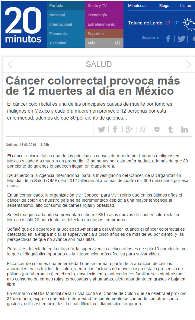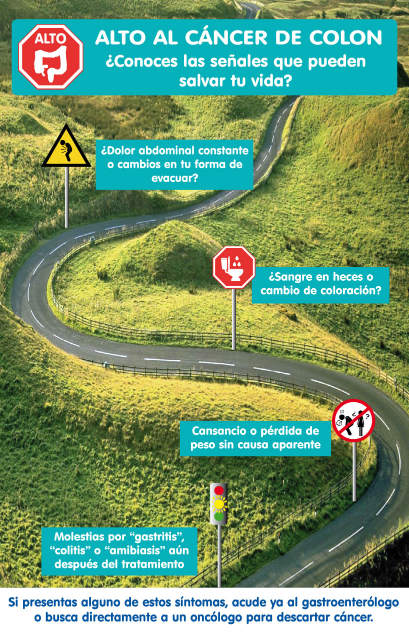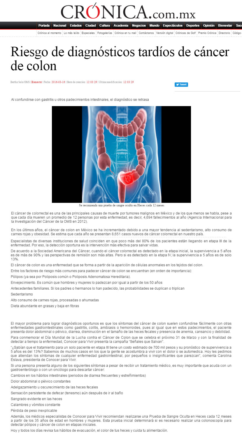 Entre los factores de riesgo más comunes para padecer cáncer de colon se encuentran (en orden de importancia): Pólipos (ya sea por Poliposis común o PoliposisAdenomatosa Hereditaria). Envejecimiento. Es común que hombres y mujeres lo padezcan por igual a partir de los 50 años Antecedentes familiares. Si los padres o hermanos lo han padecido, las probabilidades se duplican o triplican Sedentarismo Alto consumo de carnes rojas, procesadas o ahumadas Dieta abundante en grasas y baja en fibras Alto al Cáncer de Colon El mayor problema para lograr diagnósticos oportunos es que los síntomas del cáncer de colon suelen confundirse fácilmente con otras enfermedades gastrointestinales como gastritis, colitis, amibiasis o hemorroides, pues al igual que en estos padecimientos, el paciente presenta dolor abdominal o pélvico, diarrea, disminución en el tamaño de las heces fecales y presencia de anemia, cansancio y debilidad. Para conmemorar el Día Mundial de la Lucha contra el Cáncer de Colon que se celebra el próximo 31 de Marzo y con la finalidad de detectar a tiempo la enfermedad, Conocer para Vivir presenta la campaña “ Señales que Salvan”. “¿Sabían que el tratamiento para un solo paciente en etapa III tiene un costo estimado de 700 mil pesos y su pronóstico de supervivencia a 5 años es del 13%? Sabemos de muchos casos en los que la gente se acostumbra a vivir con el dolor o se automedica. Hoy les pedimos que atiendan los síntomas de cualquier enfermedad gastrointestinal, por pequeños o insignificantes que parezcan”, comenta Carolina Eslava, presidenta de Conocer para Vivir. Si una persona presenta alguno de los siguientes síntomas a pesar de recibir un tratamiento médico, es muy importante que acuda con un gastroenterólogo o con un oncólogo para descartar cáncer: Cambios en los hábitos intestinales (periodos de diarrea frecuentes y estreñimientos) Dolor abdominal o pélvico constantes Adelgazamiento u oscurecimiento de las heces fecales Sensación persistente de defecar (tenesmo) aún después de ir al baño Sangrado evidente en las heces Calambres y vómitos constante Pérdida de peso inexplicable Además, los médicos especialistas de Conocer para Vivir recomiendan realizarse una Prueba de Sangre Oculta en Heces cada 12 meses a partir de los 35 años de edad en hombres y mujeres . Esta prueba inicial determinará si es necesario realizar una colonoscopía para detectar pólipos y cáncer de colon en etapas iniciales. Hoy y todos los días revisa tus hábitos de evacuación, el color de tus heces y cuida tu alimentación. |