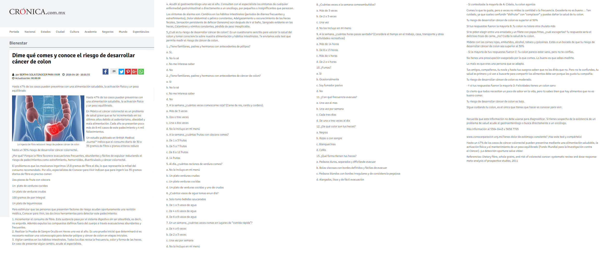 Hasta 47% de los casos pueden prevenirse con una alimentación saludable, la activación física y un peso equilibrado. La ingesta de fibra reduce el riesgo de padecer cáncer de colon. Ciudad de México a 28 de abril de 2016. - En México el cáncer colorrectal es un problema de salud grave que se ha incrementado en los últimos años debido al sedentarismo, obesidad y mala alimentación. Cada año se presentan poco más de 8 mil casos de este padecimiento y 4 mil fallecimientos. Un estudio publicado en British Medical Journal * indica que el consumo diario de 30 a 35 gramos de fibra o granos enteros reduce hasta un 30% riesgo de desarrollar cáncer colorrectal. ¿Por qué? Porque la fibra favorece evacuaciones frecuentes, abundantes y fáciles de expulsar reduciendo el riesgo de padecimientos como estreñimiento, hemorroides, diverticulosis y cáncer colorrectal. El problema es que los mexicanos ingerimos 15.8 gramos* de fibra al día, lo que representa la mitad del consumo recomendado. Por ello, especialistas de Conocer para Vivir indican que para ingerir los 35 gramos diarios de fibra es preciso comer: Dos piezas de fruta con cáscara Un plato de verduras cocidas Un plato de verduras crudas 100 gramos de pan integral Un plato de leguminosas Para estimular que las personas que presenten factores de riesgo acudan oportunamente una revisión médica, Conocer para Vivir, les da cinco herramientas para detectar este padecimiento: 1. Incrementar el consumo de fibra**. Esta sustancia pasa por el sistema digestivo sin ser absorbida, es decir, no engorda. Además expulsa los compuestos dañinos fuera del cuerpo a través evacuaciones abundantes y frecuentes. 2. Realizar la Prueba de Sangre Oculta en Heces una vez al año. Es una prueba inicial que determinará si es necesario realizar una colonoscopia para detectar pólipos y cáncer de colon en etapas iniciales. 3. Vigilar cambios en los hábitos intestinales. Todos los días revisa la frecuencia, color y forma de las heces. En caso de presentar algún cambio, acude al especialista. 4. Acudir al gastroenterólogo una vez al año. Consulten con el especialista los síntomas de cualquier enfermedad gastrointestinal o directamente a un oncólogo, por pequeños o insignificantes que parezcan. Los síntomas de alarma son: Cambios en los hábitos intestinales (periodos de diarrea frecuentes y estreñimientos) Dolor abdominal o pélvico constantes Adelgazamiento u oscurecimiento de las heces fecales Sensación persistente de defecar (tenesmo) aún después de ir al baño Sangrado evidente en las heces Calambres y vómitos constantes Pérdida de peso inexplicable 5. Responder el test “¿Cuál es tu riesgo de desarrollar cáncer de colon?”. Es un cuestionario sencillo para valorar la salud del colon y tomar consciencia sobre nuestra alimentación y hábitos intestinales. Te enviamos este test que permite medir el riesgo de cáncer de colon. Hasta un 47% de los casos de cáncer colorrectal pueden prevenirse mediante una alimentación saludable, la activación física y el mantenimiento de un peso equilibrado (Fondo Mundial para la Investigación contra el Cáncer). ¡La detección oportuna salva vidas! Referencias: * Dietary fibre, whole grains, and risk of colorectal cancer: systematic review and dose-response meta-analysis of prospective studies, 2011. Notas (La Crónica / Salud y Medicinas / sin embargo.mx) ¿Cuál es tu riesgo de desarrollar cáncer de colon? ¡Responde el test y averígualo! (Aquí van las imágenes del test y un link donde pueden consultarlo) También puedes responder este sencillo cuestionario en el siguiente link: http://bit.ly/23ZGvpz Agradecemos al portal Salud y Medicinas por permitirnos llegar a más personas a través de esta publicación. Descargar Test: Cuál es tu riesgo de desarrollar cáncer de colon |
