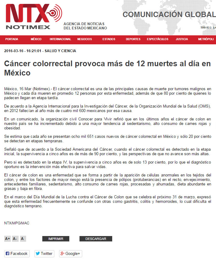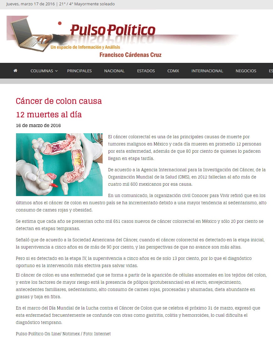 Entre los factores de riesgo más comunes para padecer cáncer de colon se encuentran (en orden de importancia): Pólipos (ya sea por Poliposis común o PoliposisAdenomatosa Hereditaria). Envejecimiento. Es común que hombres y mujeres lo padezcan por igual a partir de los 50 años Antecedentes familiares. Si los padres o hermanos lo han padecido, las probabilidades se duplican o triplican Sedentarismo Alto consumo de carnes rojas, procesadas o ahumadas Dieta abundante en grasas y baja en fibras Alto al Cáncer de Colon El mayor problema para lograr diagnósticos oportunos es que los síntomas del cáncer de colon suelen confundirse fácilmente con otras enfermedades gastrointestinales como gastritis, colitis, amibiasis o hemorroides, pues al igual que en estos padecimientos, el paciente presenta dolor abdominal o pélvico, diarrea, disminución en el tamaño de las heces fecales y presencia de anemia, cansancio y debilidad. Para conmemorar el Día Mundial de la Lucha contra el Cáncer de Colon que se celebra el próximo 31 de Marzo y con la finalidad de detectar a tiempo la enfermedad, Conocer para Vivir presenta la campaña “ Señales que Salvan”. “¿Sabían que el tratamiento para un solo paciente en etapa III tiene un costo estimado de 700 mil pesos y su pronóstico de supervivencia a 5 años es del 13%? Sabemos de muchos casos en los que la gente se acostumbra a vivir con el dolor o se automedica. Hoy les pedimos que atiendan los síntomas de cualquier enfermedad gastrointestinal, por pequeños o insignificantes que parezcan”, comenta Carolina Eslava, presidenta de Conocer para Vivir. Si una persona presenta alguno de los siguientes síntomas a pesar de recibir un tratamiento médico, es muy importante que acuda con un gastroenterólogo o con un oncólogo para descartar cáncer: Cambios en los hábitos intestinales (periodos de diarrea frecuentes y estreñimientos) Dolor abdominal o pélvico constantes Adelgazamiento u oscurecimiento de las heces fecales Sensación persistente de defecar (tenesmo) aún después de ir al baño Sangrado evidente en las heces Calambres y vómitos constante Pérdida de peso inexplicable Además, los médicos especialistas de Conocer para Vivir recomiendan realizarse una Prueba de Sangre Oculta en Heces cada 12 meses a partir de los 35 años de edad en hombres y mujeres . Esta prueba inicial determinará si es necesario realizar una colonoscopía para detectar pólipos y cáncer de colon en etapas iniciales. Hoy y todos los días revisa tus hábitos de evacuación, el color de tus heces y cuida tu alimentación. |